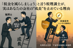 札幌の黒字社長様へ。今の税理士との会話に物足りなさを感じていませんか?「節税」ばかり勧める税理士が、実は会社の成長を阻害している理由と、未来を創る「経営コンサル型税理士」との決定的な違いを解説します。
