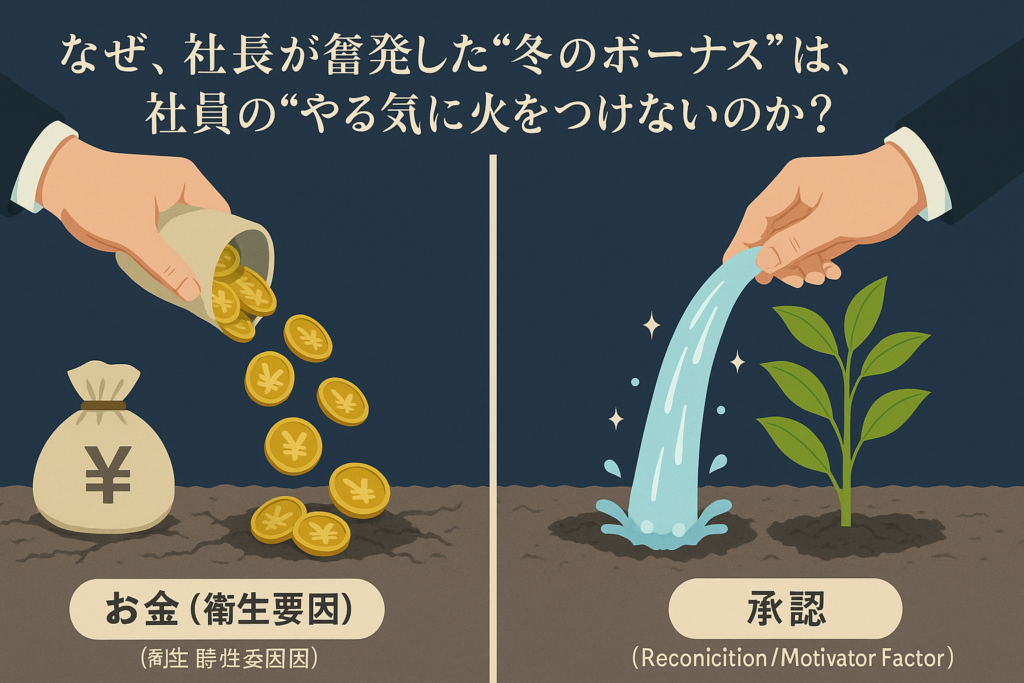 代表コラム2025年11月2日『なぜ、社長が奮発した“冬のボーナス”は、社員の“やる気”に火をつけないのか?~お金(衛生要因)と「承認」(動機づけ要因)の決定的な違い~』